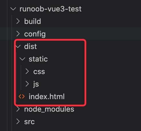 执行完成后,会在 Vue 项目下会生成一个 dist 目录,该目录一般包含 index.html 文件及 static 目录,static 目录包含了静态文件 js、css 以及图片目录 images(如果有图片的话)。
