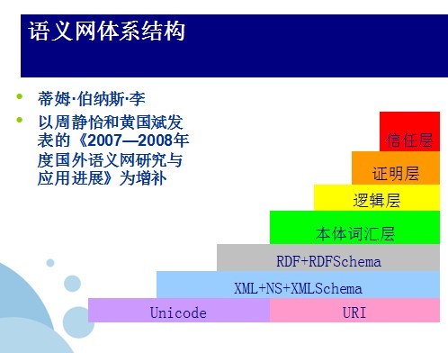 语义网的体系结构正在建设中,当前国际范围内对此体系结构的研究还没有形成一个令人满意的严密的逻辑描述与理论体系,中国学者对该体系结构也只是在国外研究的基础上做简要的介绍,还没有形成系统的阐述。